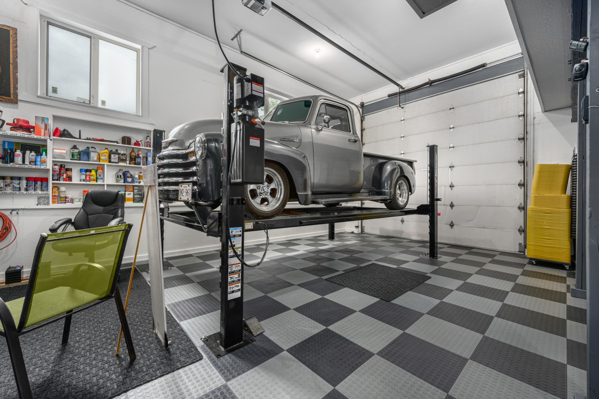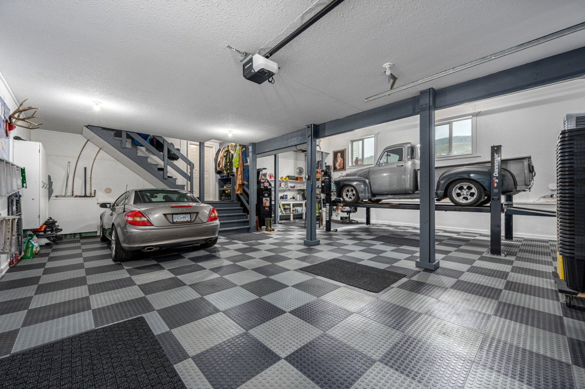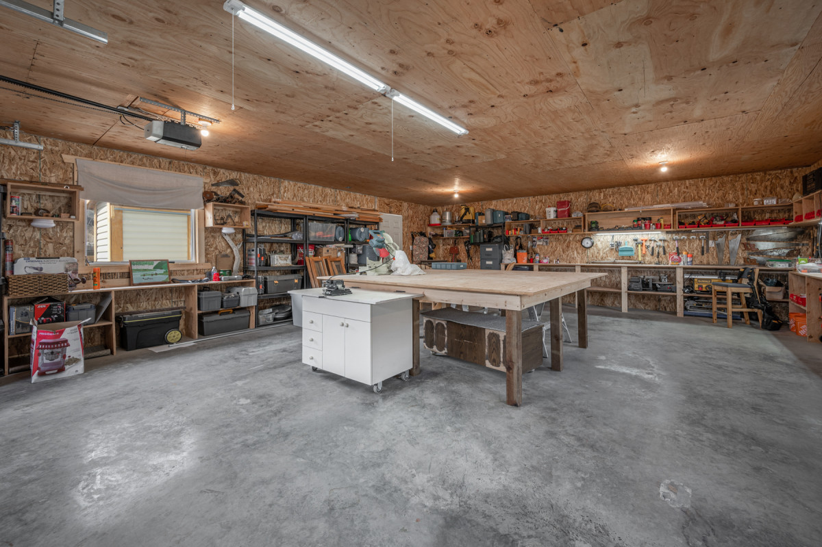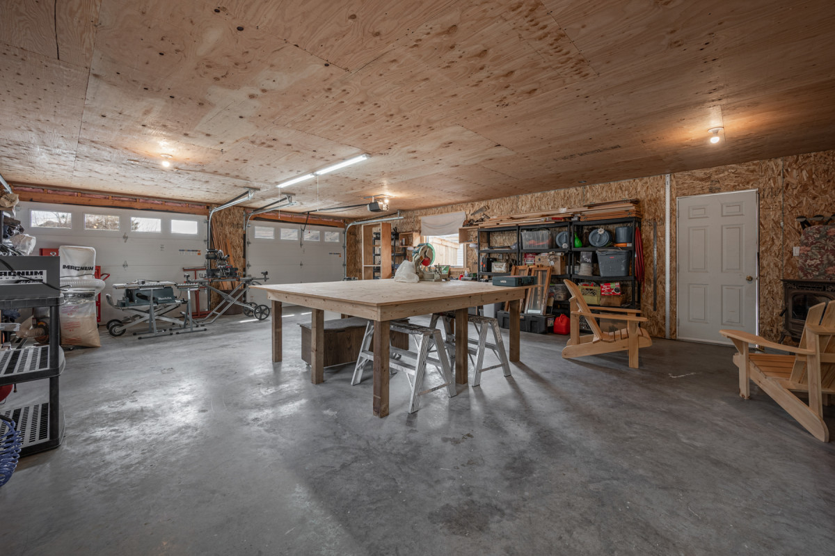 • 4 car garage with hoist, a detached workshop with its own electrical service, Storage Sheds